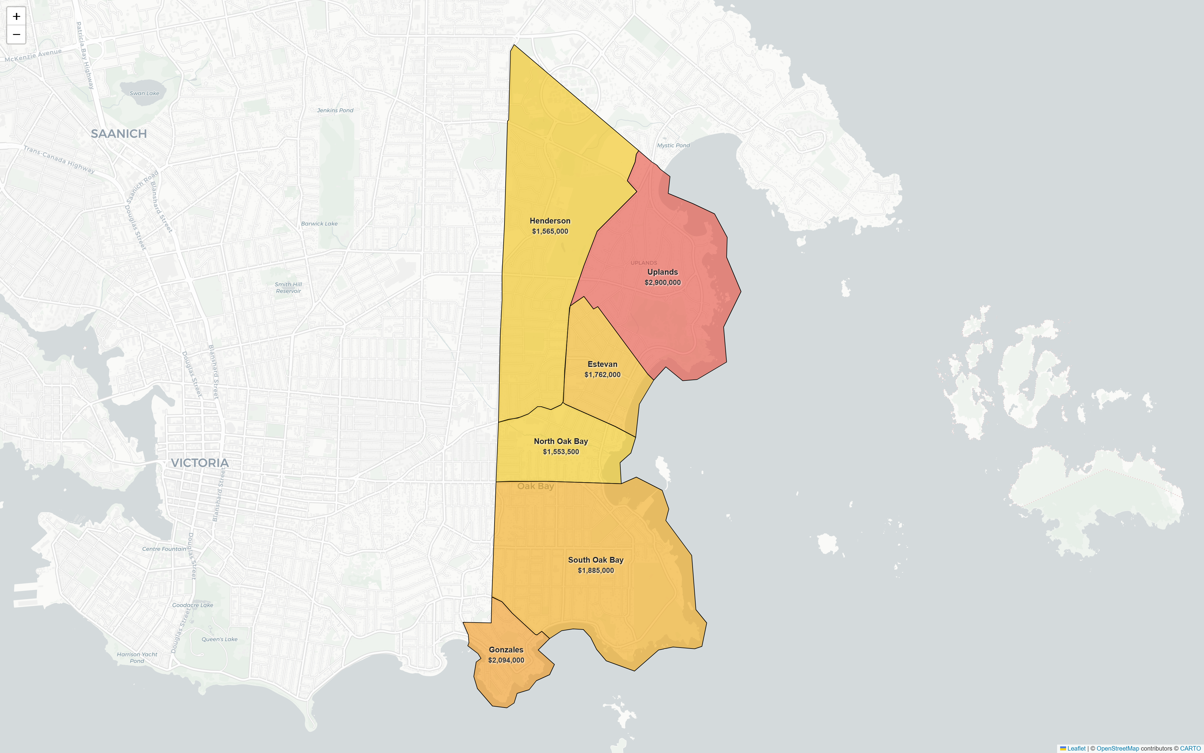 • 价格最高的三个子区域依次为Uplands(中位价2,094,000)和South Oak Bay(中位价$1,885,000)。