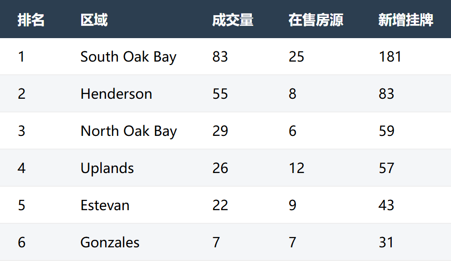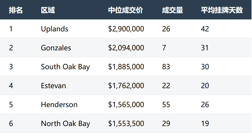 • 交易量最大的三个子区域分别是South Oak Bay(83套成交)、Henderson(55套成交)和North Oak Bay(29套成交),显示South Oak Bay在市场活跃度方面领先。