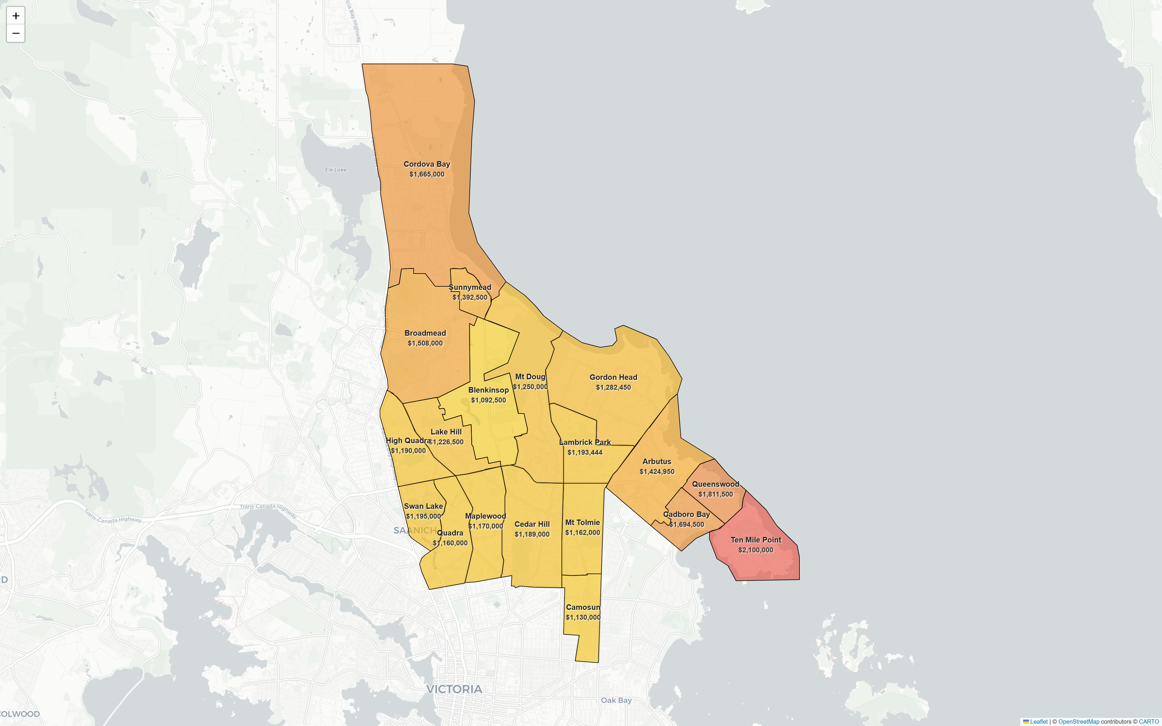 很难想象,维多利亚至今还没有一张图,能够直观呈现各个社区的房产成交状况。我尝试画出这样一张地图——以下是Saanich East共19个片区的独立屋房价分布图,数据统计区间为过去365天。颜色越红,代表该区域房价越高;颜色越黄,则代表房价相对较低。